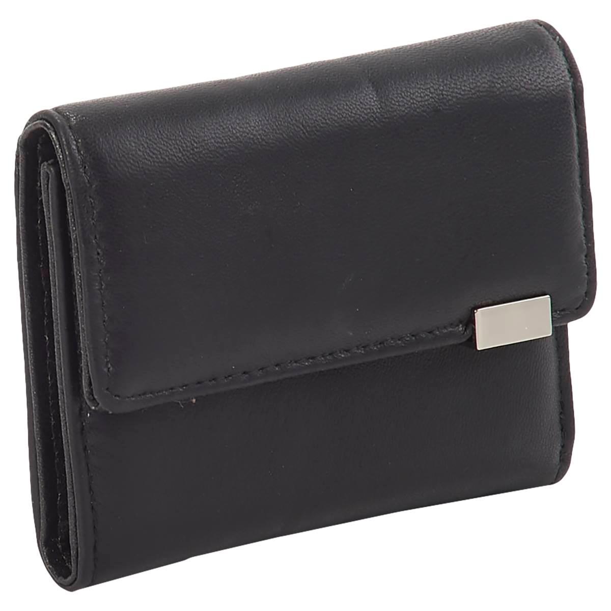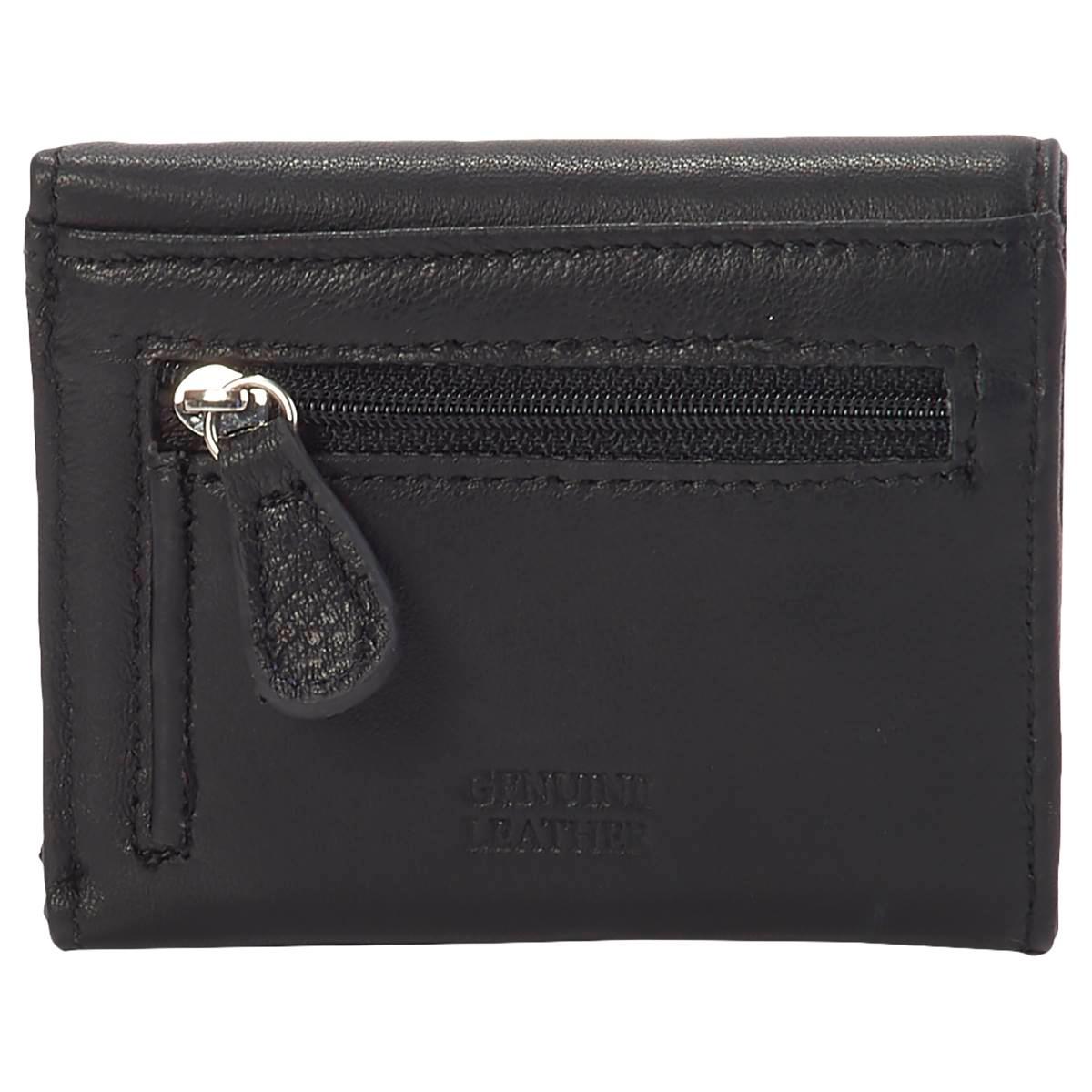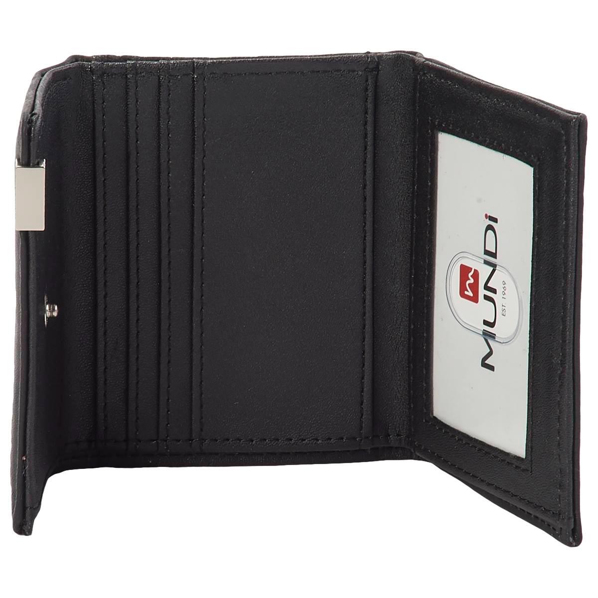 This slim and sleek Womens Mundi mini trifold wallet is sure to keep your money safe and secure. With a snap closure , back zip pocket, and card, bill, and ID slots, this genuine leather wallet will fit perfectly in any your handbags with ease. Exterior: 1 zip pocket Interior: 1 ID window, 4 card slots, 1 bill slot.