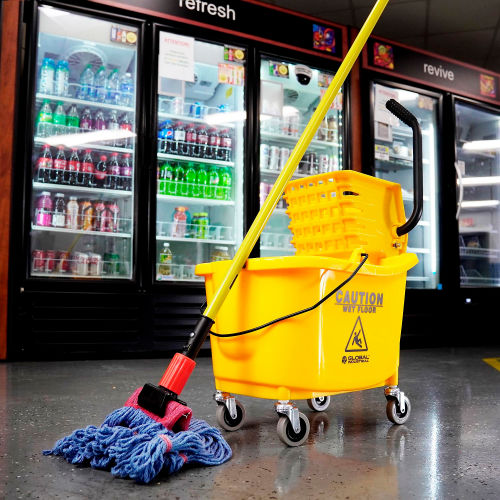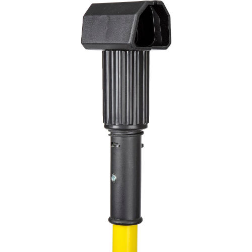 Global Industrial mop handle features plastic jaws that firmly clamp mop heads. Allows quick and easy mop changes. Twist action secures mop head in place. Recommended for 5" wide headband mops. length diameter fiberglass handle. Black/Yelllow.