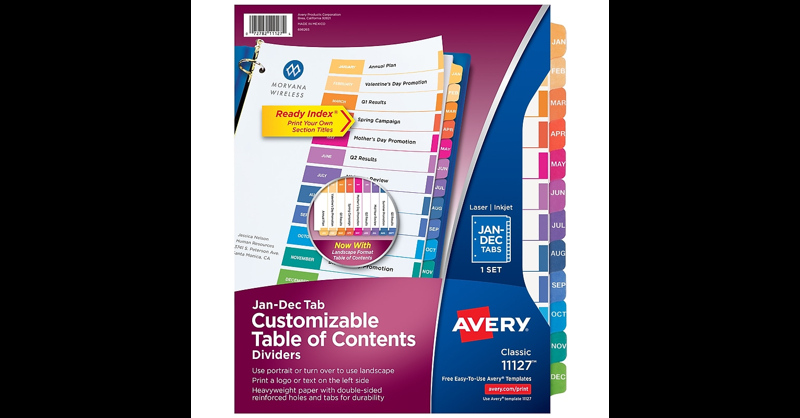 Organize your projects in moments with Avery Ready Index monthly binder dividers. Each tab is preprinted and uniquely color coded for a professional appearance. Print your own custom section titles and images onto the table of contents sheet without worrying about labels or inserts. Whether you're creating planners for classes or hosting a presentation, these dividers are ideal for getting everything sorted. Monthly 12 dividers are included with each sheet measuring 8-1/2"x11". The 3 binder holes are reinforced on both sides of the heavyweight sheet to prevent creasing and tearing. Each divider tab includes additional reinforcement along the edge of each page to distribute stress and resist folding. The printable table of contents is dual compatible with both laser and inkjet printers. This sheet can also be printed in either portrait or landscape so that your projects can be displayed in any orientation. Just flip the sheet to view the other layout on the opposite side. Try out free templates for these dividers and check out the Avery Design & Print software at avery. com/templates. Keep track of your tab dividers quickly and easily with the printable table of contents sheet. Add graphics, logos and titles to the table of contents page with free templates at avery. com/templates. 1 set of 12 Jan-Dec dividers are included with sturdy tab and hole reinforcements on both sides. Reinforcedtabs are preprinted and don't require inserts or labels. Versatile design works in either portrait or landscape orientation and is great for project binders and training manuals. Securely insert the 3 hole-punched paper dividers into your favorite 3 ring binder. The page dividers' table of contents is both inkjet and laser printer compatible. Stay organized and enjoy a professional binder appearance suitable for any work or home office with the uniquely color-coded tabs. Reference documents easily with these Avery Ready Index January-Decembertable of contents monthly tab dividers.