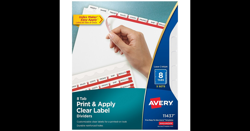 Easily create print shop quality personalized binder dividers with tabs using Avery Index Maker Clear Label Dividers. Customize the title tabs for your dividers quickly and easily using the free templates on the Avery website and print with your inkjet or laser printer for clean, professional looking results in minutes. This pack comes with five sets of 8-tab dividers, and the Easy Apply clear label strips make it simple to apply all 8 labels of each set at once. Just print, align labels against tabs, smooth down labels and peel up strip. Each 3-hole punched durable divider also features doubled-sided, reinforced tabs and edges to help resist tearing for long-lasting, everyday use. These 3 ring binder dividers with tabs are a great addition to your medical office supplies, school binders, personal organizers, tax office supplies, presentation reports and more. Print, peel, and press your way to a perfect, precise project. Save time and money by creating your own high-quality custom tab dividers using free templates from the Avery website and printing on your laser or inkjet printer. Label all 8 tab dividers at once with the Index Maker Easy Apply Label strip that results in five perfectly aligned sets of tabs. Get a professional, printed-on look with clear labels that virtually disappear on thedivider tabs. Great for organizing your medical document binder, meeting materials, proposals, tax organizer binder, financial planner and more. Long-lasting, tear-resistant tabbed dividers feature doubled-sided reinforced tabs and edges. Subdivide your binders with this five-pack of Avery Index Maker eight-tab clear-labeldividers.