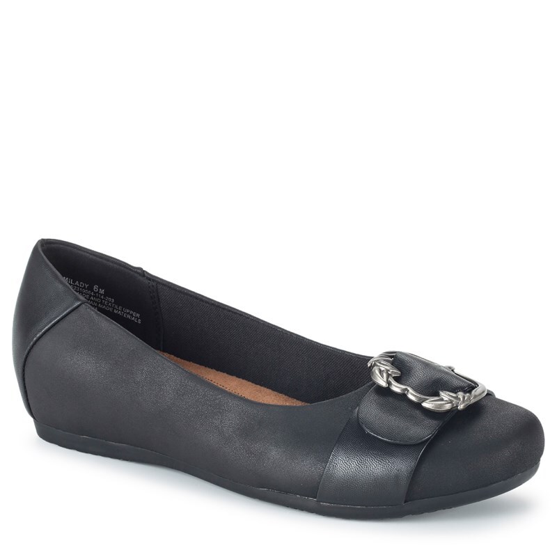 The Women's Baretraps Milady Flat provides your outfit with the timeless sophistication you crave. Vegan leather upper in a flat style with a round toe. Slip on entry. Cushioned memory foam insole and soft lining. Durable slip resistant manmade outsole.