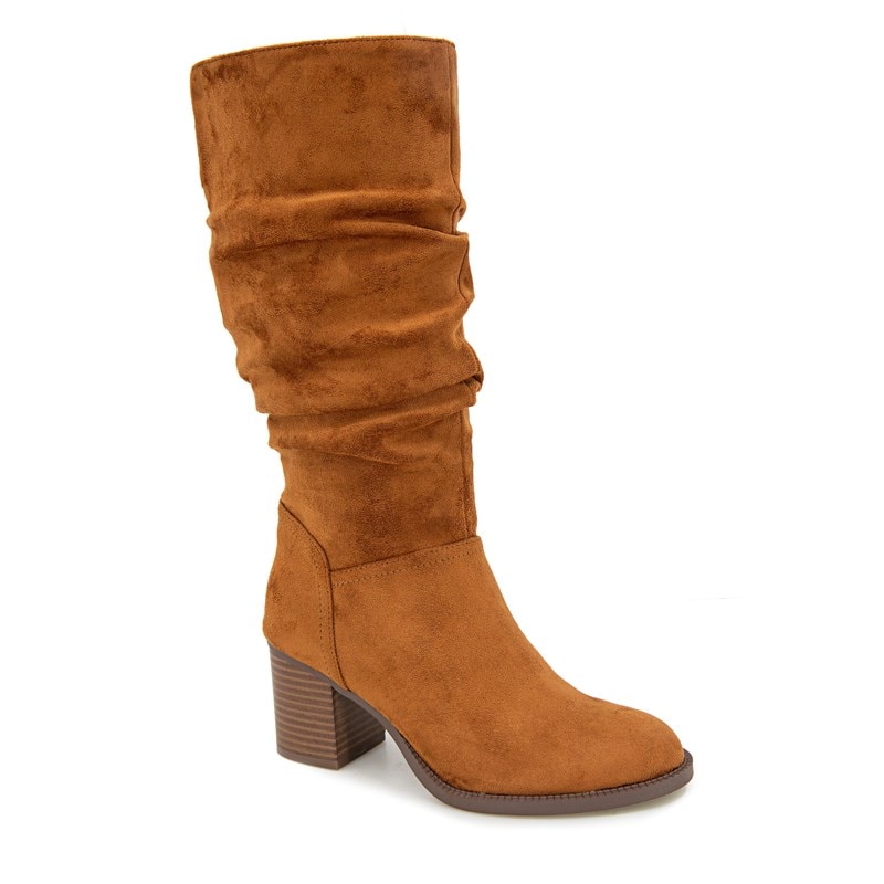 The Women's Kenneth Cole Reaction Sonia Block Heel Tall Boot adds a chic touch to any fall look. Micro suede upper in a boot style with round toe. Zipper closure. Features stylish rushed details. Cushioned memory foam insole. 2.5 inch block heel. Durable synthetic outsole.
