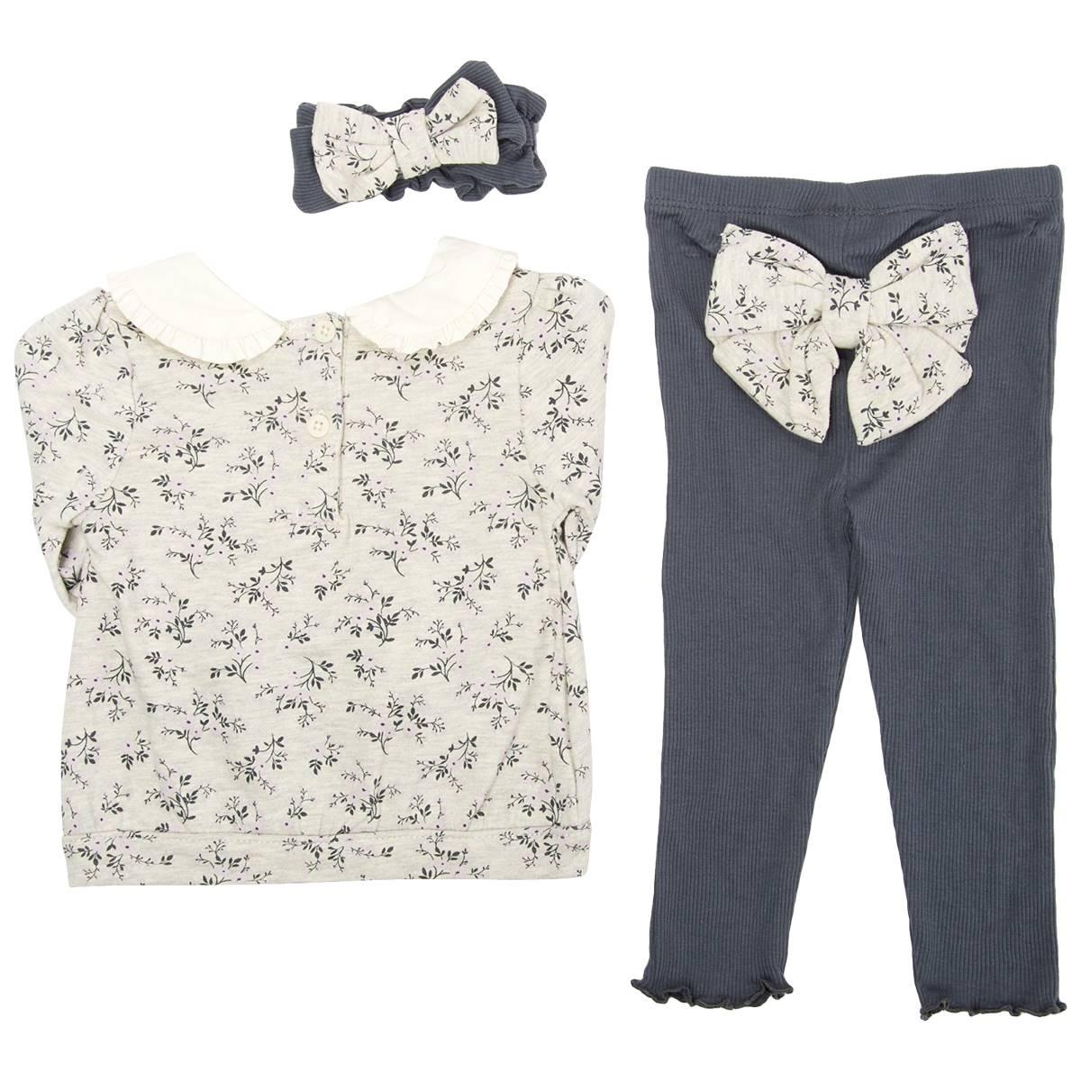 Top: Pattern: Marled, Floral Sleeve Length: Long Sleeve Peter pan collar with pleated trim Rear button placket Elastic cuffs with ruffle trim Reinforced Hem Fleece lined for comfort and warmth Soft Fabric Pants: Pattern: Solid Covered elastic waist Oversized floral bow on back Lettuce trim hems Ribbed fabrication for a comfy fit and stretch Stretchy Fabric Includes a matching fabric headband with bow Turn inside out to wash.