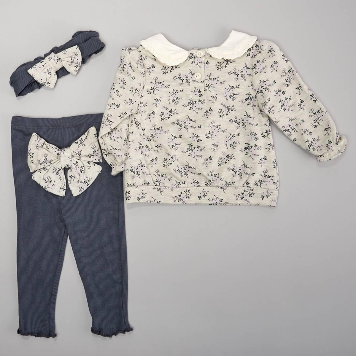 Top: Pattern: Marled, Floral Sleeve Length: Long Sleeve Rear button placket Pleated trim peter pan collar Elastic ruffle cuffs Reinforced Hem Fleece lined for comfort and warmth Soft Fabric Pants: Pattern: Solid Covered elastic waist Lettuce trim hems Oversized floral bow on back Ribbed fabrication for a comfy fit Soft and stretchy fabric Includes a matching headband Turn inside out to wash.