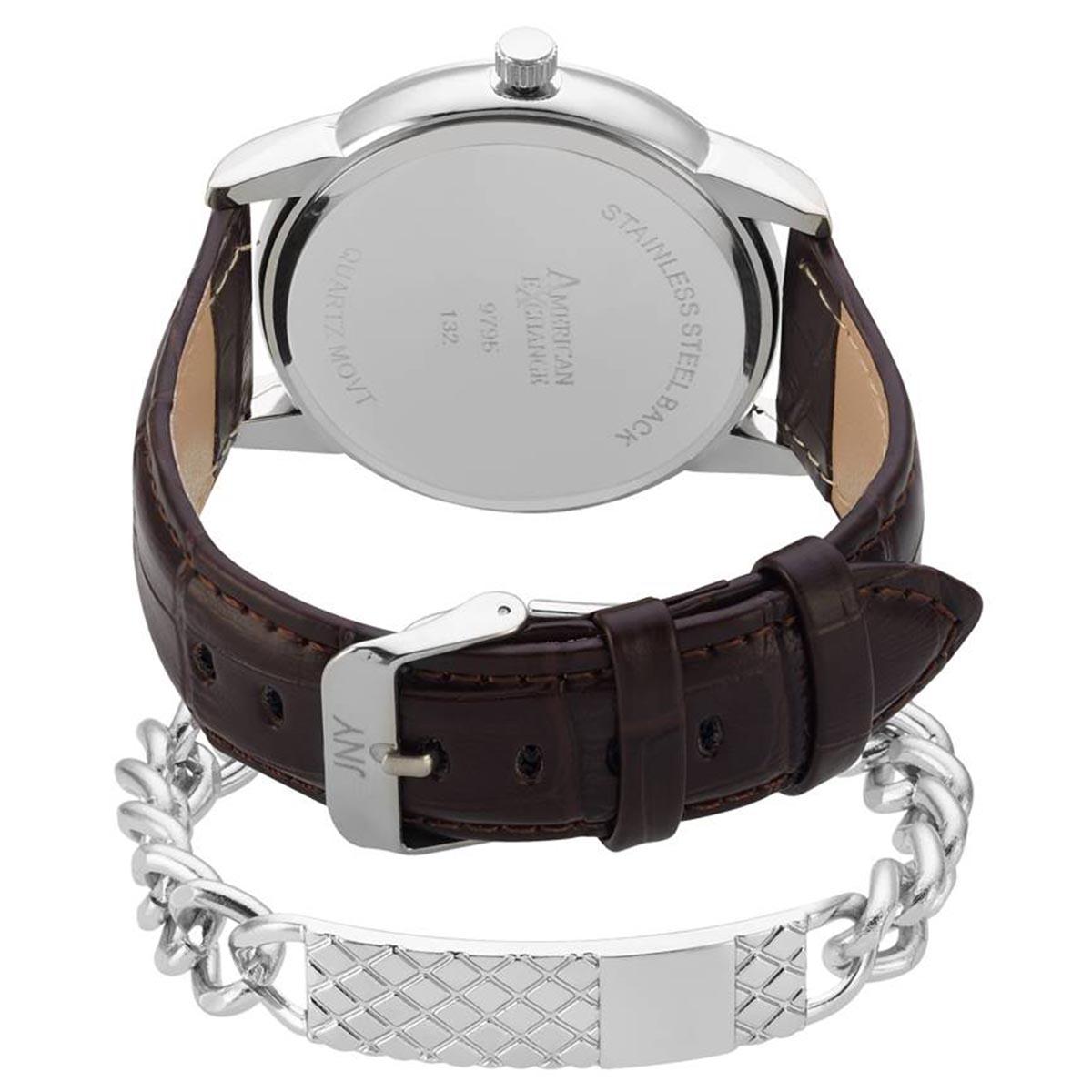 The Mens Jones New York analog watch and ID tag bracelet gift set is a timeless sophistication with, a captivating ensemble crafted to enchant. Encased within a resplendent round frame of gleaming silver tone metal alloy, measuring a distinguished 44mm in diameter with a graceful case thickness of 10mm, this horological marvel exudes an aura of opulence and grace. Its luxuriouscroco PU leather strap, secured with a buckle closure and adjustable to approximately 248mm, offers a refined embrace, ensuring a perfect fit for every occasion. Behold the mesmerizing navy 3D pyramid texture dial, a celestial canvas of understated allure, boasting dimensions of 38mm in diameter. Adorned with day, date, and 24 hour indicator sub dials, this watch transcends mere functionality to become a symphony of timeless refinement. With the precision of quartz movement and a bandwidth of 22mm, it promises not just to keep time but to capture hearts with its exquisite blend of sophistication and charm. Whether gracing a business meeting or a special event, this watch and ID tag bracelet set is the epitome of distinguished elegance, an eternal companion on life's illustrious journey. Style: 9776S-42-J16 Case Dimensions: 44m Dial Dimensions: 38mm.