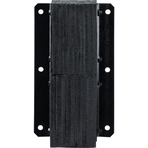 HEAVY DUTY DOCK BUMPER Tough plies of fabric impregnated rubber pads are compressed and secured by 3/4" thick steel rods and mounted to 1/4" thick angle iron brackets. Absorbs over 80% of the impact force. Pre-drilled 13/16" anchor bolt holes offer quick installation. Allow 12" between each bumper for dependable protection.