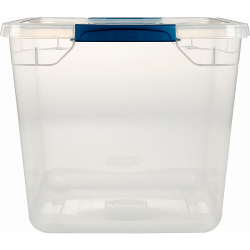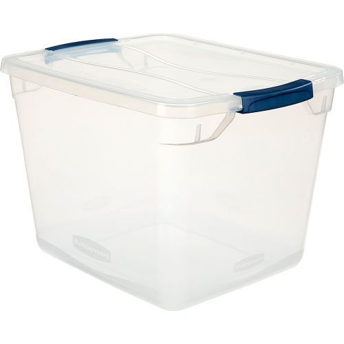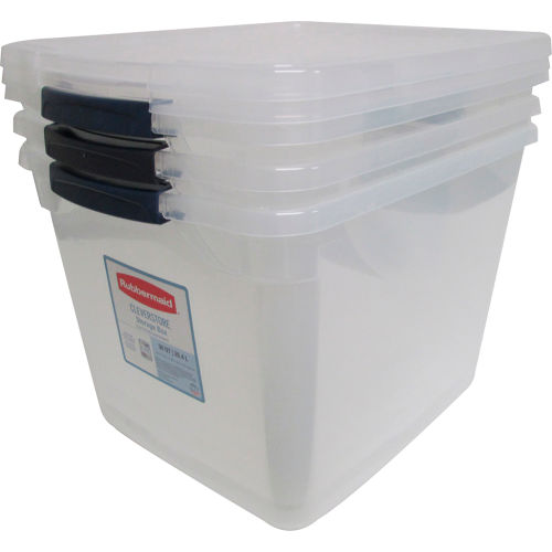 Rubbermaid Cleverstore Clear Latching Storage Tote w/Lid 30 Quart 16-7/8 x 13-3/8 x 11-1/2 Clever Store containers have a straight wall design that maximizes storage space holding up to 14% more than other containers in the same space. The handles and lid have a square edge design to fit efficiently into cabinets, closets and other areas. The recessed lid ensures superior stacking. Made using clear transparent plastic for easy viewing of contents. - Pkg Qty 8.