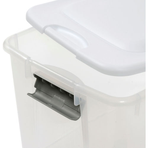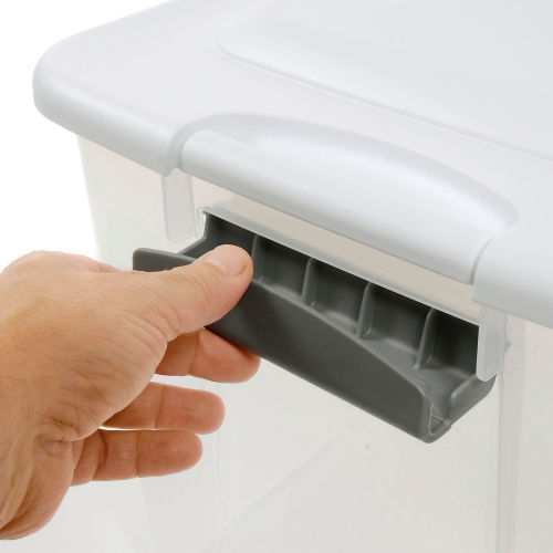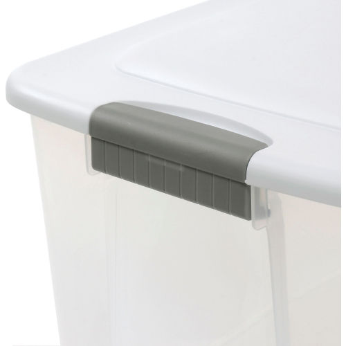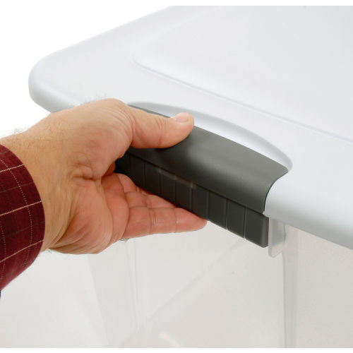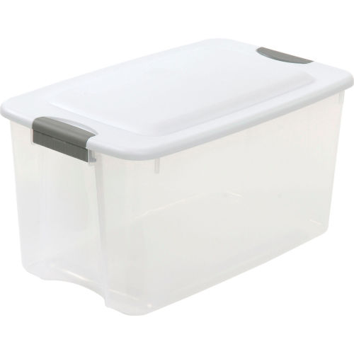 Sterilite Clear Storage Tote With Lid Quart 26-1/8x16-1/4x13-1/2 - 19889804 CLEAR STORAGE TOTES WITH LID Clear storage totes with lid allows practical, efficient storage for any light duty applications. Ergonomic latches attach the lid securely in place. Integrated handles with contoured ends for easy lifting. Made using a white plastic lid with clear transparent plastic container for easy viewing of contents. Lids feature an indexed surface area for stability when stacking units. Sold in carton quantity. - Pkg Qty 4.