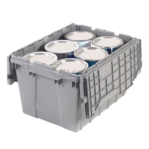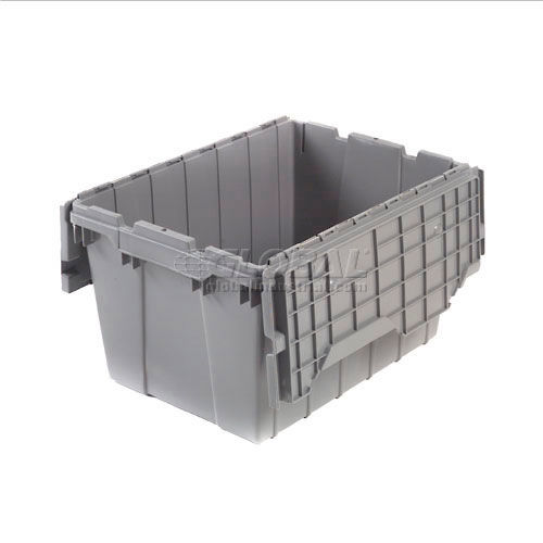 Akro-Mils Attached 39170GREY - 21-1/2"L x 15'W x 17"H Lid Container This opaque gray high-density industrial grade polymer container has reinforced ribs and closes with a padlockable hinged lid that interlocks for extra strength. Plastic Containers nest when open to save space. Molded hand grips allow easy lifting. Full length stainless steel hinge pins ensure security. Sold in carton quantities. - Pkg Qty 3.