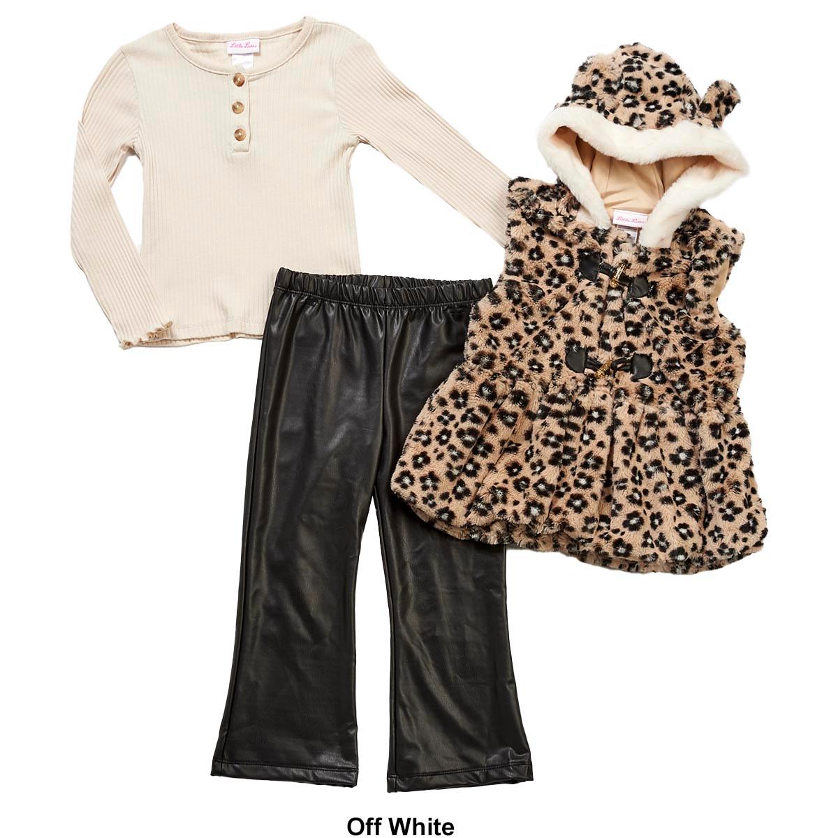 Set Includes: A Vest, Top, & Pants Vest: Pattern: Floral, Dots Hooded with contrasting trim and 3D ear detail Two toggle closures with glitter detail Gathered Waistline Elastic Hemline Super soft faux fur fabric Silky Lining Top: Pattern: Solid Sleeve Length: Long Sleeve Round Neckline Front button placket Lettuce trim cuffs Ribbed fabrication for a comfy fit and stretch Pants: Pattern: Solid Covered elastic waist Flare leg styling Faux leather fabric Fleece lined for comfort and warmth Turn inside out to wash.