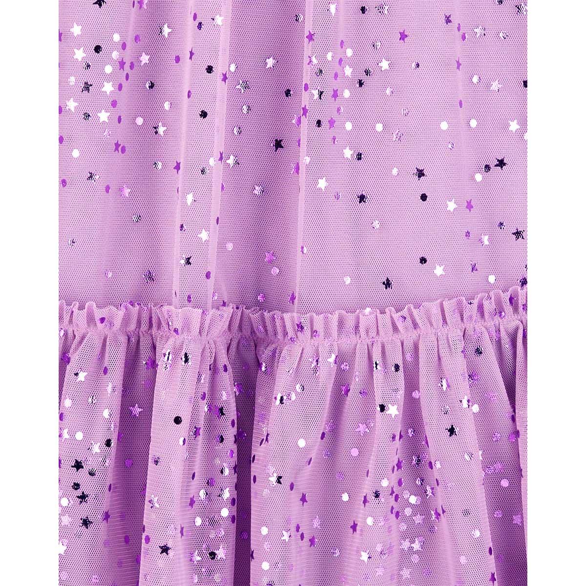 Dress: Pattern: Stars Sleeve Length: Sleeveless Non-adjustable straps Shiny foil stars throughout Peplum hem with ruffle seam Fun and light tulle fabric Fully Lined Top: Pattern: Solid Sleeve Length: Short Sleeve Round Neckline Soft Fabric.