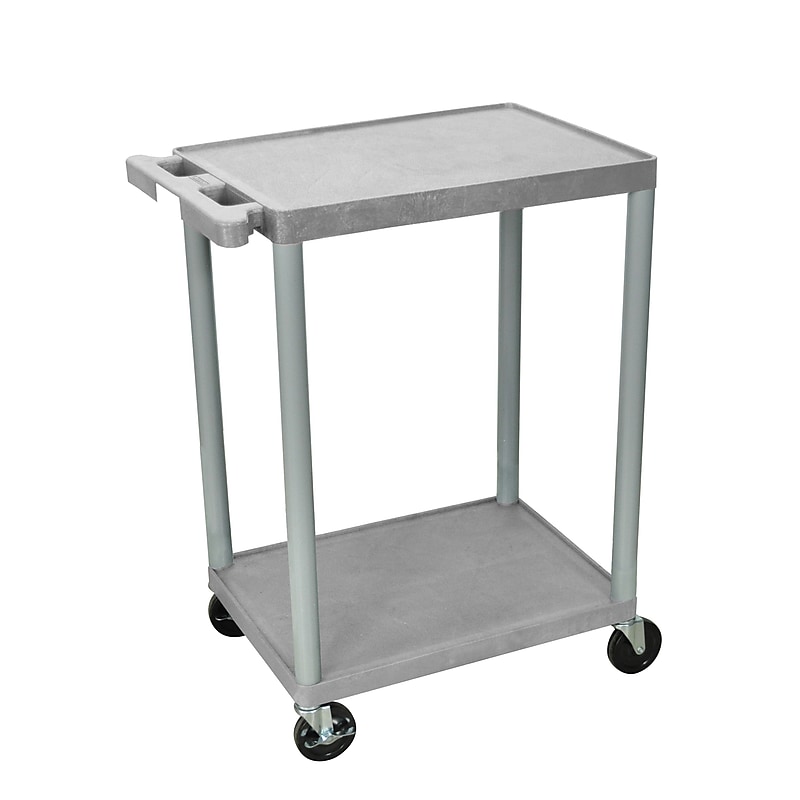 Luxor HE 2 Shelves utility cart color measures 33 1/2" x 24" x 18" and has 26" clearance between shelves. 2 Shelves utility cart has 400 lbs capacity and features four heavy duty 4" casters. Gray. Dimensions: 33 1/2"(H) x 24"(W) x 18"(D). Made of high density polyethylene structural foam molded plastic shelves and legs that won't stain, scratch, dent or rust. Clearance between shelves is 26". Assembly required. Weight capacity: 400 lbs. Four heavy duty 4" casters, two with locking brake. Has a push handle molded into the top shelf. Retaining lip around the back and sides of flat shelves. Includes four heavy duty 4" casters, two with brake. Luxor HE 2 Shelves utility cart color features high density polyethylene structural foam molded plastic shelves and legs that offers resistance to stain, scratch, dent or rust.