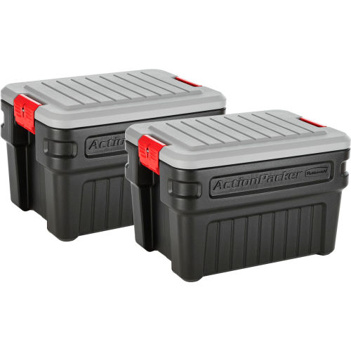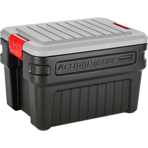 Rubbermaid ActionPacker Lockable Storage Box 24 Gallon 26-1/8 x 18-1/2 x 17 The ActionPacker 's rugged construction makes it tough. Features tough, lockable latches (lock sold separately) This Rubbermaid (Rubbermaid) ActionPacker storage container is made to take whatever you throw at it. Plus, you can use a bungee cord to secure the container (bungee cord not included). Price per each container, sold in carton qty. - Pkg Qty 4.
