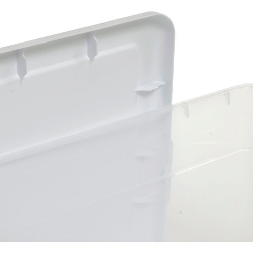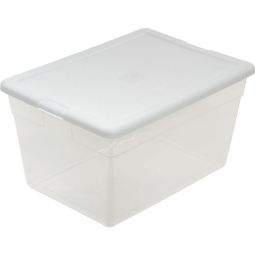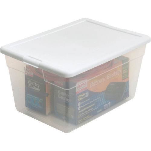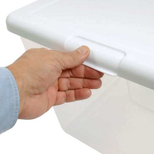 Sterilite Clear Storage Tote With Lid Quart 23x16-1/4x12-3/8 - 16598008 CLEAR STORAGE TOTES WITH LID Clear storage totes with lid allows practical, efficient storage for any light duty applications. Ergonomic latches attach the lid securely in place. Integrated handles with contoured ends for easy lifting. Made using a white plastic lid with clear transparent plastic container for easy viewing of contents. Lids feature an indexed surface area for stability when stacking units. Sold in carton quantity. - Pkg Qty 8.