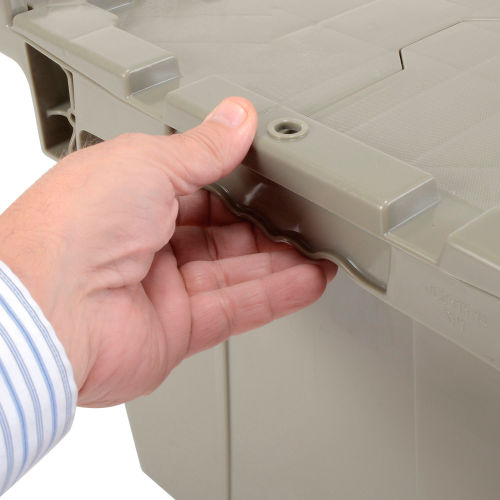 Plastic Storage Container - Attached Lid DC2515-14 25-1/4 x 16-1/4 x 13-3/4 Gray Safe, Secure, and Sustainable. The improved all plastic attached lid container leads the industry in design and proven performance. Taken out was the traditional metal hinge replacing it with a safer and more durable all plastic hinge. This series of plastic shipping containers is the choice of much of the distribution industry. Manufactured from high grade-high density polyethylene plastic, the enhanced storage container is made to ship, store, and distribute goods and products in the toughest of environments. The all new plastic hinge design means there is no metal in the hinge of the container making this container the safest and most sustainable in the market. Raised lip edges allow secure stacking. The attached lid container saves money too while allowing empty containers to nest inside each other when not in use. Molded grip handles have an integral hasp to accept cable ties for security. The Best Value plastic storage container offers increased safety and durability all at a great value.