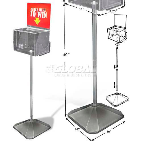 Wide High Deep clear Acrylic Suggestion Box with 5.25" Wide Slot, Lock & Key on 40" Pedestal with 16" Square Base. Includes 6.125" Wide 4" High front pocket and Wide 8.5" High sign holder. Overall height is 57.5". Ships unassembled (no tools required).
