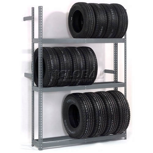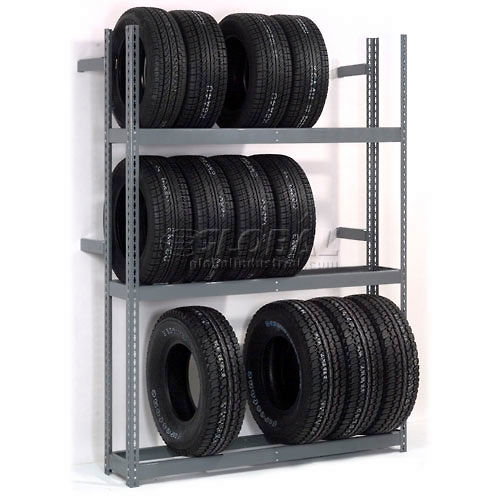 Boltless Tire Rack Double Entry Safely store and display automobile and light truck tires with this strong roll formed steel rack with positive interlocking beam and post connections. Construction includes 2-1/4" x 1-1/2" x 14 gauge uprights and double riveted horizontal beams that adjust vertically on 1-1/2" increments. Fast, easy assembly without tools, nuts or bolts. Durable gray baked enamel. Built for Tires Only. This double entry racks are 2 units joined with tie beams with an aisle in between.