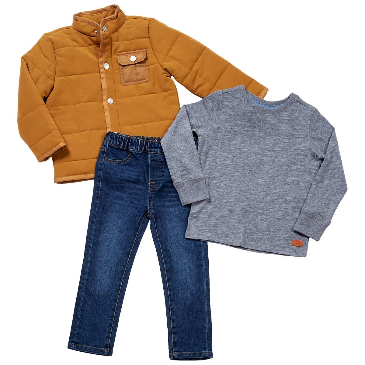 Set Includes: A Jacket, Tee, and Pants Jacket: Pattern: Quilted Standing Collar Full-length snap button closure One chest pocket with snap button closure Logo patch near left hem Fully Lined Tee: Pattern: Marled Sleeve Length: Long Sleeve Ribbed neckline and cuffs V-stitch detail Logo patch near left hem Soft Fabric Pants: Pattern: Solid Covered elastic waist Faux fly stitch and pocket detail Two rear patch pockets Logo tag on rear right waist and right pocket Contrasting stitch detail throughout Authentic denim- soft, stretchy, comfortable, durable Turn inside out to wash.
