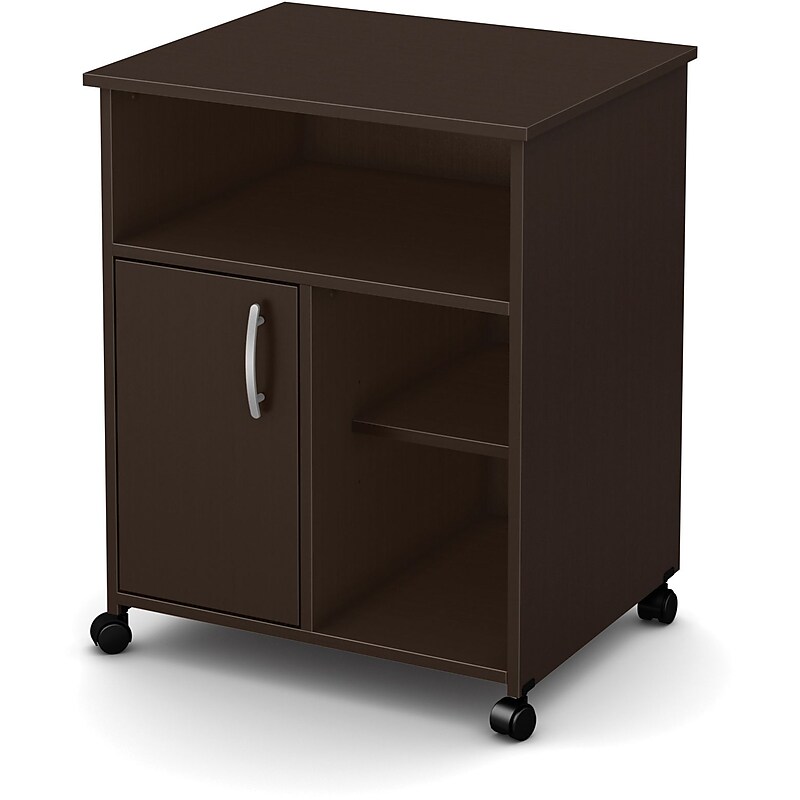 Add a multipurpose mobile piece of furniture to your office or home to better utilize your space. The South Shore Mobile Media Printer Cart is a functional piece that can be used as a printer stand, for storage, or to house a coffee machine. The wood-grain laminate add a sophisticated feel to any space. Mobile media printer cart. Laminate finish. 3 open shelves, 1 privacy door, and 1 adjustable shelf. Casters provide unit mobility. Dimensions: 29 x 23 x 19 inches (HxWxD). Full assembly required. 5-year manufacturer limited warranty. Adjustable shelf behind the door provides easy organization. Weight capacity of 15 pounds on adjustable shelves. ⚠ WARNING: This product can expose you to chemicals including formaldehyde, which is known to the State of California to cause cancer or birth defects or other reproductive harm. For more information go to www. P65Warnings. ca. gov/furniture. Mobile Media Cart.