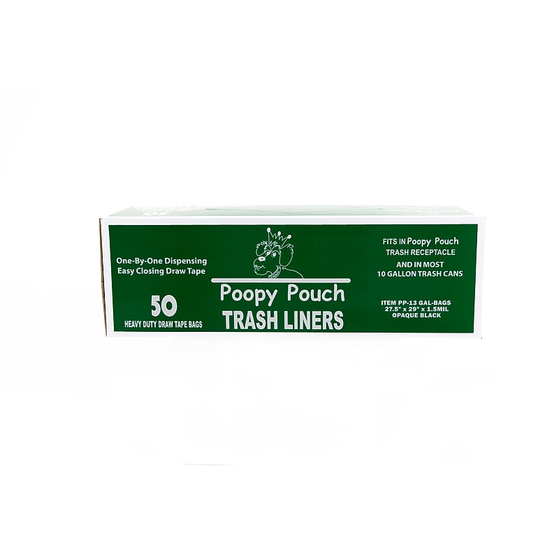 These heavy duty trash liners have a with draw tape for convenience. They are guaranteed to fit most 10-13 gallon waste receptacles. A nice compliment to any pet waste station. 50 bags per boxed roll. they are 1. 5 mil thick and measure 27. 5" x 29" x 2. 25". 5". gal. trash liners ideal for any pet waste station. 1. 5 mil. 50 bags per box. Draw tape closure prevents the need for twist ties. Bag Size: 27. 5" x 29" x 2. 25". Color: For use with the Poopy Pouch Waste Receptacle with Lid. Compatible with any gallon trash can & waste receptacle. Crown Products Poopy Pouch Trash Liners feature a draw tape to seal waste neatly and quickly.