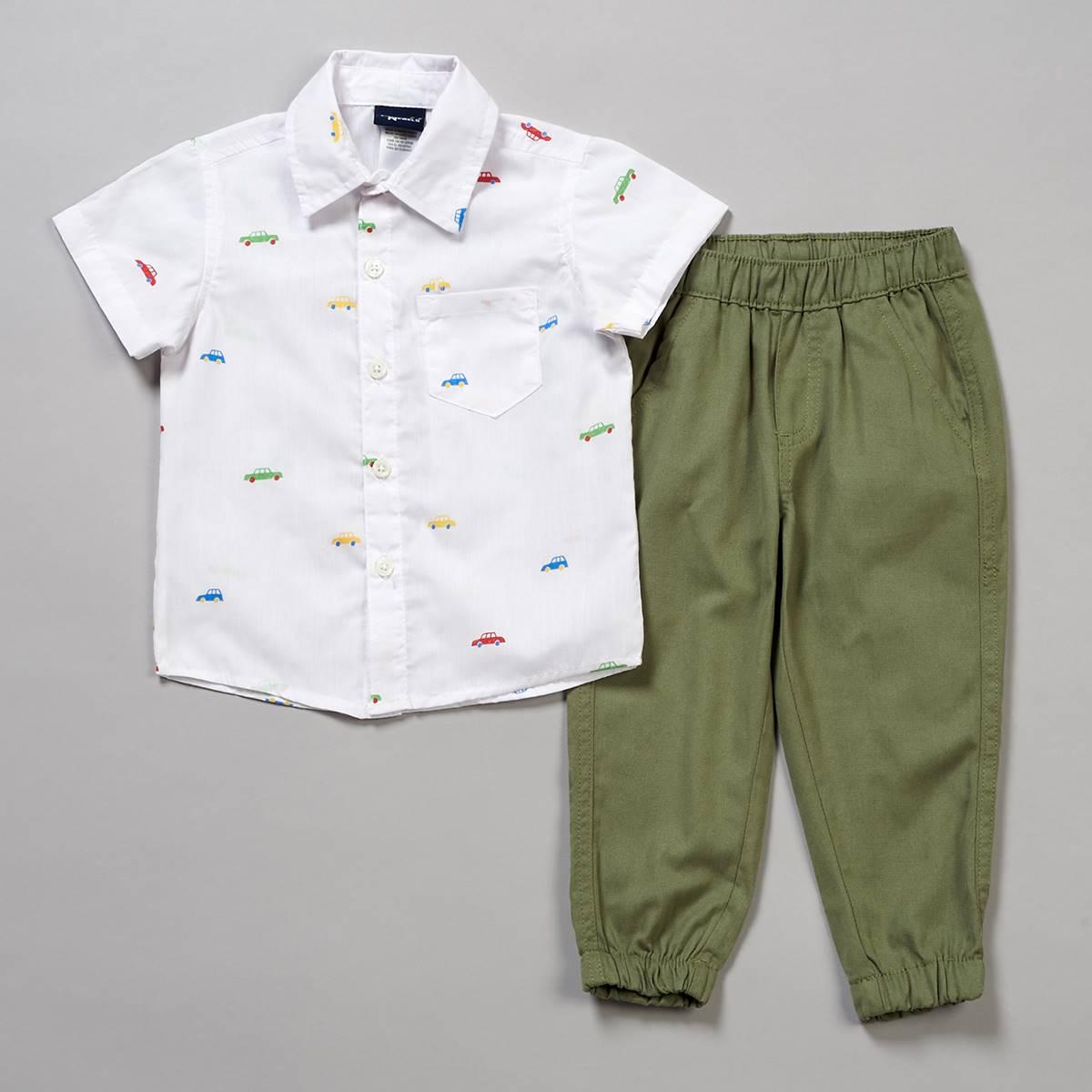 Top: Pattern: Cars Sleeve Length: Short Sleeve Fold down collar Full-length button closure One chest patch pocket Rear center pleat at upper back seam Lightweight material Pants: Pattern: Solid Covered elastic waist and hems for a comfy fit Two side slash pockets Faux fly stitch detail Denim feel material Have your little one looking good for casual occasions in this airy, car themed button down and pants set Turn inside out to wash.