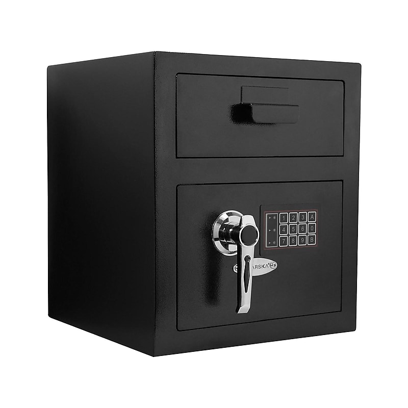 Get strong protection for cash and other items with this standard keypad depository safe. With the ability to store up to two unique PIN codes, this safe provides convenient access for owners and managers. The anti-fishing baffles on the deposit door prevent thieves from using wires and extendable tools to lift out contents, and the predrilled mounting holes let you bolt this safe to the floor or wall, preventing it from being removed from your home or office. This Barska keypad depository safe comes with two keys for easy access to stored items, while the steel construction and dead bolts provide extra security. Safe provides safety and security for your essential documents and most valuable possessions. Steel construction with keypad lock and optional traditional key access. Safe capacity 0. 72 cubic ft. Overall dimensions: 16"H x 13. 75"W x 13. 75"D. Interior dimensions: 8"H x 13. 5"W x 11. 5"D. Product weight: 41. 75 lbs. Retains two PIN codes. Anti-fishing baffles on drawer. 1-year manufacturer limited warranty. ⚠ WARNING: Cancer and Reproductive Harm www. P65Warnings. ca. gov. Protect cash, checks, and coins from theft or getting lost by placing them in this Barska standard keypad depository safe.