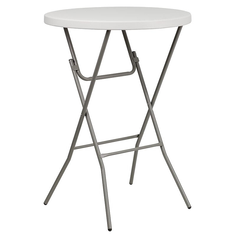 Host mixers at your venue for Wednesday Wind Down, make it a social setting incorporating these bar height cocktail tables. These pub tables encourage everyone to stand around and mingle as your mixologist serves up delicious signature drinks to keep people coming back to your lounge. When you invite friends over to your backyard bash this cocktail table is perfect for socializing or grabbing snacks poolside. This table can comfortably seat up to 3 adults to enjoy friendly conversation. Let the birthday girl shine at her own table while everyone sits at table height tables. The legs fold flat to transport and store away. These event tables are a must have for your event rental business or banquet hall to add variety to your seating. Although designed for indoor events this party table can be used outdoors on the deck or patio during good weather but must be stored indoors. Round Plastic Folding Tables. Color: Material: Metal, Plastic, Plastic: Polyethylene. Seats up to 3 Adults. Overall Dimensions: 31. 5"Dia. 30"H; Shape: Round. Weight Capacity: 165 lbs. Evenly Distributed. Meets or Exceeds ANSI/BIFMA Standards; Rated for Commercial Use. Fully Assembled. Ready To Use Commercial Table. 2. 63' Folding Table. 1. 75" Thick Granite White Top is waterproof, impact and stain resistant. Non-Locking Bar Height Gray Powder Coated Cross Legs with protective floor caps. Warranty: 1 Year Limited. Folding tables offer versatility as tables for holidays and parties or for the event facility to setup beautiful arrangements.