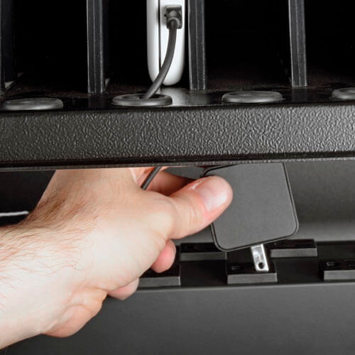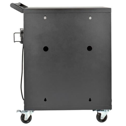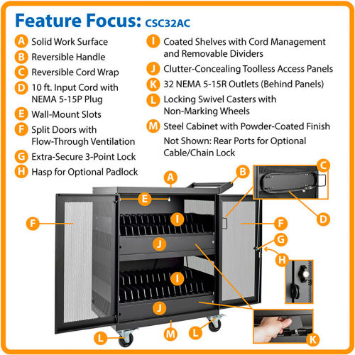 The CSC32AC 32-Device AC Charging Station Cart provides AC charging, secure storage and cord management for up to 32 Chromebooks and laptops. It's recommended for education, office, commercial, retail, industrial and healthcare environments. 32 AC outlets provide convenient charging for Chromebooks and laptops with a screen size up to 17 inches. Their AC adapters plug into the cart's 32 NEMA 5-15R outlets as needed, up to 1,440 total watts. The CSC32AC also charges tablets and other USB devices through their power adapters. A built-in circuit breaker protects against overloads. The 10-foot AC input cord with NEMA 5-15P plug reaches distant outlets to help you place the cart in a convenient location. The cart promotes comprehensive device protection with steel construction and a black powder-coated finish for long-term durability. It locks with the included keys to help prevent device theft, damage or tampering, and flow-through ventilation helps prevent overheating. The cart also encourages clutter-reducing organization of devices and cabling. AC outlets, power adapters and cords store out of sight. Toolless trim panels permit quick service access. When moving devices from room to room, the cart provides convenient mobility. Large swivel casters with non-marking wheels improve the ride over uneven surfaces and lock to help prevent unwanted movement at rest. The reversible wide-grip handle assists cart control. The cart is easy to configure. It ships ready for quick, easy installation, and the handle and cord wrap attach on either side. The split front doors open 180 degrees for improved device and service access. Rear-panel slots support optional wall-mount installation, and removable shelf dividers accommodate thicker devices. Charges 32 Chromebooks and laptops up to 17 in. screen sizeSecures devices in locking, vented, wall-mountable steel cart Protective shelves with removable dividers and cord managementWide-grip handle and locking casters with non-marking wheels Ships ready for quick, easy installation Certifications: Tested to EIA-310-E, FCC & IEC Class B, UL 1363 (Power Component) RoHS Compliant 2-year limited warranty Allow additional space required for the power adapters, power cords and protruding power plugs from the devices.