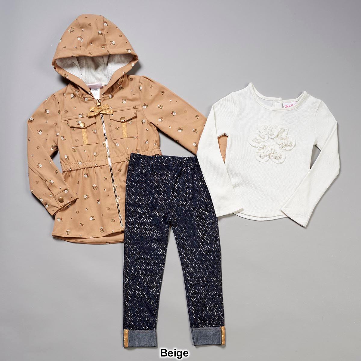Set Includes: A Jacket, Top, and Leggings Jacket: Pattern: Floral Sleeve Length: Long Sleeve Waffle knit thermal fabric hood lining Full-length zipper closure with glitter bow pull tab Gathered shoulder seams Snap button cuffs Two patch pockets with snap button closure and glitter thread accent on chest Covered elastic waist for a good fit and stretch Gold glitter detail and hardware throughout Top: Pattern: Solid Sleeve Length: Long Sleeve Round Neck Rear button placket Cinched ruffle in the shape of a flower with raw edges accent Waffle knit thermal fabrication for warmth and stretch Leggings: Pattern: Foil Dots Covered elastic waist for a good fit and stretch Gold foil dots throughout Fixed fold over hems with gold thread side seam detail Denim Look Soft and stretchy feel.
