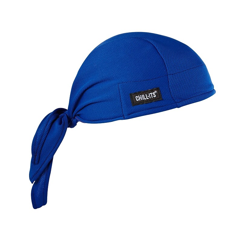 Ergodyne Chill-Its 6615 Blue high performance dew rag contains an absorbent terry area and elastic band for maximum performance/wearability. Dew rag with cooling absorptive is ideal for construction, trade and maintenance. Absorbent terrycloth band. One size fits most. Applications: Construction, trades, maintenance, landscaping/grounds, assembly/fabrication, material handling, freight/baggage, warehousing/distribution, iron/steel fabrication. Hi Cool moisture management performance fabric. Comfortable to wear under hats, helmets or alone. Elastic band for a great fit. Cooling absorptive, hi cool moisture management. Machine washable. Elastic band for secure, good lookin fit. Absorbent terry headband. One size fits all. 6 per carton. Closure type: Tie. Ergodyne Chill-Its 6615 Blue high performance dew rag is made with hi cool fabric that absorbs as well as removes moisture from the head keeping it cool/dry and is comfortable to wear under hat/helmet or alone.
