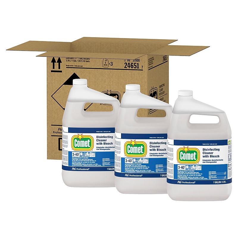 Comet Disinfecting Cleaner With Bleach is a two-in-one all purpose cleaner formula that combines the cleaning power of heavy-duty detergents with the stain-removal power of bleach. A hospital-use disinfectant when used per label instructions, It is effective as a disinfectant in 60 seconds against Hepatitis A and C, Norovirus, and 39 other microorganisms (See EPA master label for full list of organisms and contact times. Not yet approved in CA). Comet Disinfecting Cleaner With Bleach contains no abrasives and uses remarkable cleaning technologies that may be used to clean customer and employee restrooms, tracked-in dirt and scuffmarks, kitchen-area stains, plastic trash containers, greasy equipment containers and other surfaces. Kills 99. 9% of bacteria and viruses in one minute (see EPA master label for full list of organisms and contact times). Combines the power of a heavy-duty restroom cleaner and surface deodorizer. Removes greasy soap scum with 50% fewer strokes. Included on the EPA List N: disinfectants for use against the novel coronavirus SARS-CoV-2. Cleans and sanitizes in one step when used per label instructions. Works great as a bathroom disinfectant (when used according to disinfecting instructions) on toilets, sinks, chrome, tile, tubs and fiberglass. Comet cleaner with bleach. 128 oz. bottle. Includes three 128 oz. bottles. Safety Data Sheet . Maintain fresh, clean restrooms or kitchens in commercial areas with this 3-pack of 128-ounce Comet disinfecting cleaner with bleach.