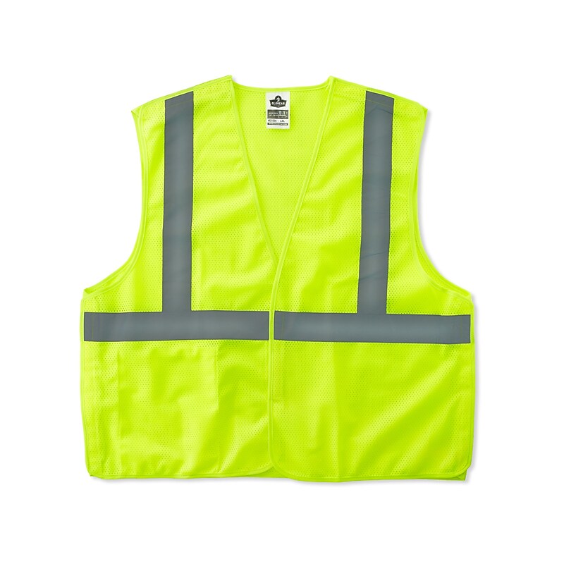 Ergodyne GloWear 8215BA Class 2 economy breakaway 4xL/5xL vest color is made of polyester mesh material for durability. Vest with hook and loop closure is ideal for road construction, utility crew, railway workers & baggage handlers. Size: 4XL/5XL. Color: Lime. Five point hook and loop breakaway. Material: Polyester mesh. Closure type: Hook and loop. Pockets: One inside. Tape Specification: (1) 360 deg, (2) Vertical. 2" level 2 ANSI certified tape. Includes hook and loop on both shoulders and sides. Applications: Road construction, utility crew, survey crew, construction, railway workers, baggage handlers, emergency response, warehousing/distribution. Standards: ANSI 107-class 2 certified. Certifications and Standards: ANSI/ISEA 107-2015 Class 2, Type R compliant. With five point hook and loop breakaway, Ergodyne GloWear 8215BA Class 2 Economy Breakaway Vest also features a 2" level 2 ansi certified tape.