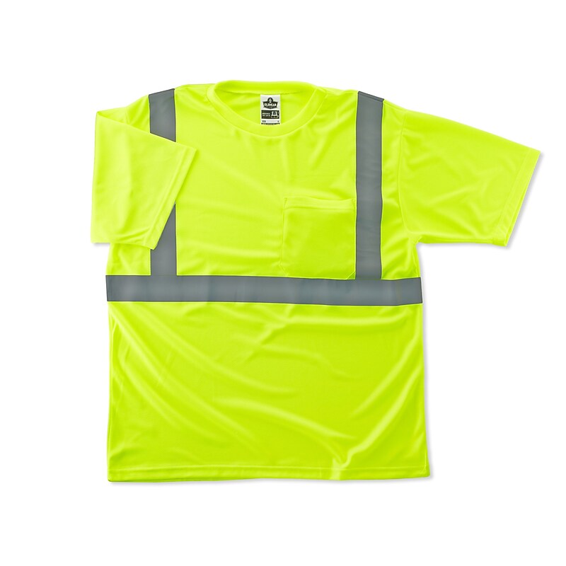 Ergodyne GloWear class 2 economy T-Shirt is made of polyester color with high visibility reflective stripes to keep workers safe and seen in occupation where risk is high. T-Shirt with moisture wicking treatment keeps workers cool. Size: Large. Color: Lime. Shirt wicks away moisture to keep workers cool and comfortable all day long. Material: Polyester. Pockets: One exterior. Style: Economy. Department: High visibility clothing. Tape specification: (1) 360 degrees, (2) vertical: one outside pocket. ANSI-compliant polyester breathable knit (3. 3 oz. ). 2" Level 2 ANSI-compliant reflective material. Level 2 reflective stripes applied across the chest and shoulders keep workers compliant. Designed with technical fabrics for optimal wicking and fast drying na machine washable. High visibility - Includes visibility enhancing materials like retroreflective tape and fluorescent colors. Reflective accents includes retroreflective details to help keep workers safe and seen. Applications: Road construction, utility crew, survey crew, construction, railway workers, baggage handlers, emergency response, warehousing distribution. Standards: ANSI 107-class 2 certified. Weight: 0. 46 lbs. Tape specification: (1) 360, (2) vertical: one outside pocket. Dimensions: 15 1/4"(H) x 10 1/4"(W). Class 2 Short Sleeve T-Shirt. Color: Hi-Vis Lime. ANSI-compliant polyester breathable knit (4. 1 oz. ). Moisture wicking treatment. Heat transfer reflective for flexible comfort. Pockets: One outside chest. lime class 2 economy t-shirts shirt wicks away moisture to keep workers cool and comfortable all day long.