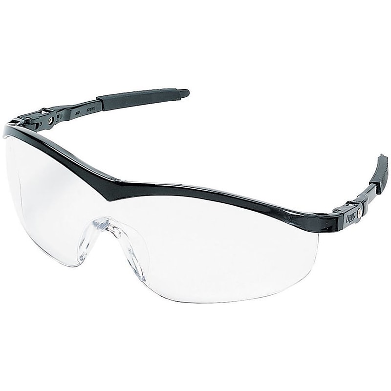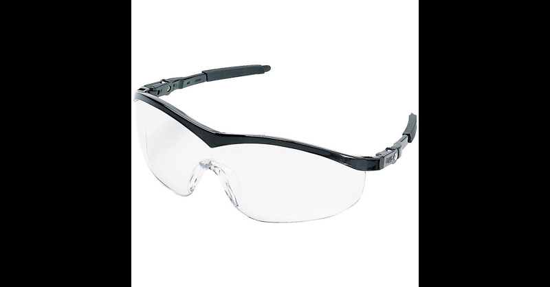 Workers in the Storm can expect extreme comfort with this face-flattering protective eyewear from Crews Ratchet action temples combined with non- slip rubber head grips create a customized fit for virtually any head size. Lens tint/frame color:black. Lens coating: Duramass scratch resistant. Lens material: Polycarbonate. VLT %: 85. Temple type: Bayonet. Color: Black (frame and temple, temple sleeve). Lens design: Single. Frame material: Nylon. Universal nosebridge fits a variety of facial profiles. Non slip soft temple sleeves. Welding lens options available. Available in 18 frame colors and lens tint combinations. Usage: Head and eye protection. Testing and approvals: Meets or Exceeds ANSI Z87+ CE EN166,CAN/CSA Z94. 3. Lightweight safety glasses. Single wraparound dual focal point lens with integral side shields. 5 position ratchet action bayonet temples. MCR Safety Storm ST110 Protective Eyewear features a single wraparound dual focal point lens with integral side shields for eye protection.