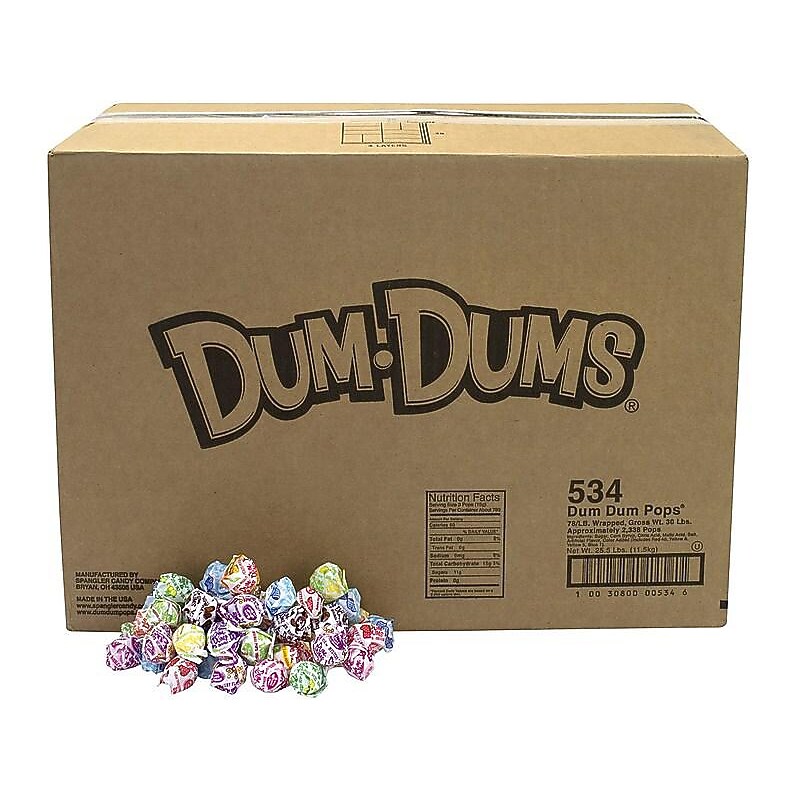 Who doesn't love a Dum Dum? They are an American classic treat and the ultimate feel-good candy. Available in this big bulk box to fill up all candy dishes in your business. Flavors include watermelon, strawberry, cherry, grape, blue raspberry, root beer, sour apple, cream soda, butterscotch, cotton candy, bubble gum, mango, tangerine, blueberry, and the mystery flavors. Lollipops are a perfect addition to any dessert table. Everyday theme. The product is kosher, gluten-, fat-free, and free of the top common allergens. oz. package. Assorted-color flavors include orange, lime, mango, lemon, strawberry, cherry, apple, blueberry, peach, grape, cream soda, watermelon, fruit punch, butterscotch, blue raspberry, bubblegum, cotton candy, and root beer. Individually wrapped candies allow everyone to grab as much as they want. Made in the USA. Stock the office, classroom or waiting room with this oz. variety pack of Dum Dums lollipops to let employees and visitors enjoy a nostalgic treat.