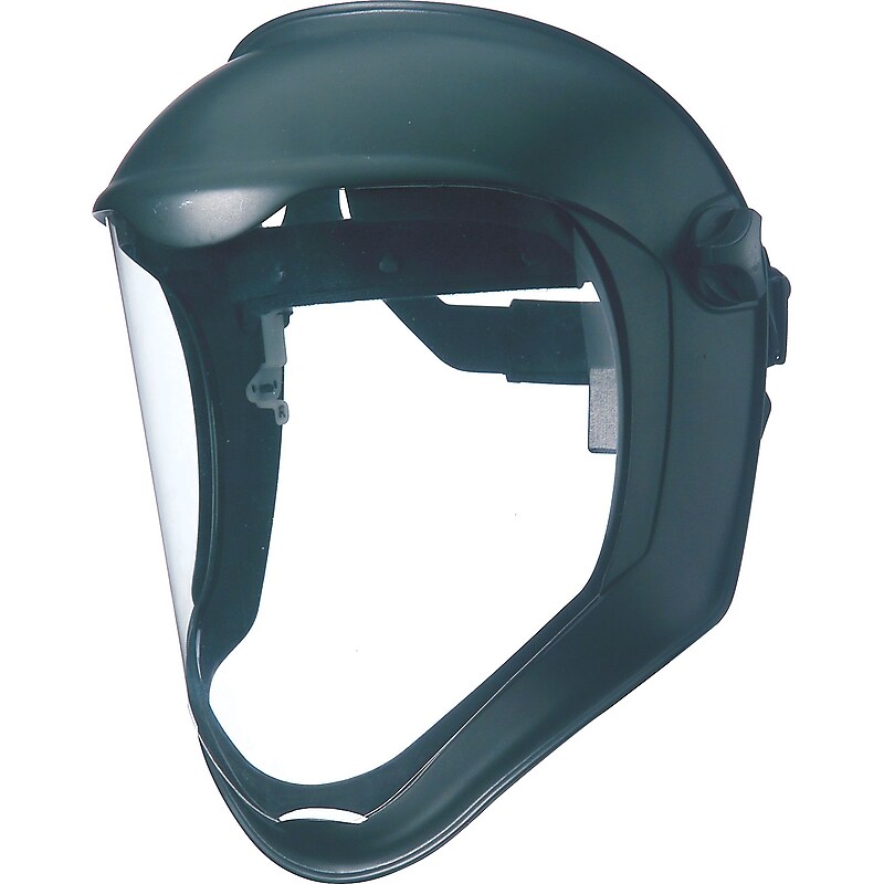 Lightweight Hard Coat/Anti-Fog face shield provides all-day comfort and full protection from chin to the top of the head. Panoramic polycarbonate window furnishes increased visibility and minimal blind spots. Efficiently shuts out airborne dust, dirt and debris. Easily accommodates other protective equipment such as respirators and safety eyewear. Foam-padded head-strap for snug, secure fit. Face Shield. Black/Clear. Polycarbonate/Foam. 1 each. Uvex Bionic Face Shield Windows. Breathable, removable and washable headband. Highly adjustable headgear tilts visor nearer or farther from face, depending on preference and application. Shell offers built-in chin protection and extended top-of-the-head coverage. Color: Black matte. Lens type: Anti-Fog/Hardcoat clear polycarbonate. Suspension: Ratchet. Enhanced protection from airborne debris. Easily replaceable visor with dual position choices. Secure visor attachment. Lightweight and balanced, ergonomic design for extended use. Comfortable cell foam on back of headgear. Breathable, removable, washable headband. Excellent optics and increased visibility. The Bionic Shield is a revolutionary face shield. Designed for rugged jobs, its tough where it has to be, yet extremely lightweight and balanced for all-day comfort.