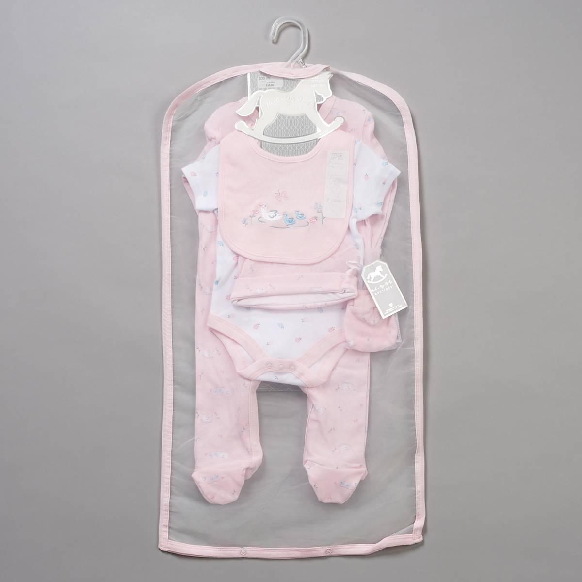 Set Includes: (1) Sleeper, (1) Bodysuit, (1) Bib, (1) Hat, and (1) Pair of Scratch Mittens Sleeper: Pattern: Floral, Ducks on a Pond, Butterflies Sleeve Length: Long Sleeve Rib-knit trim for a comfy fit Full-length snap button closure Built-in footies Bodysuit: Pattern: Floral Sleeve Length: Short Sleeve Contrasting rib-knit neckline and hem Overlapped shoulders for easy pull-over Durable snap button bottom Bib: Pattern: Solid Rib-knit trim Embroidered ducks on a pond, butterfly, and flowers Durable snap button closure Hat: Pattern: Floral, Ducks on a Pond, Butterflies Rolled Hem Scratch Mittens: Pattern: Floral, Ducks on a Pond, Butterflies Rib-knit cuffs for a good fit Easy pull-on design Includes a free gift box.