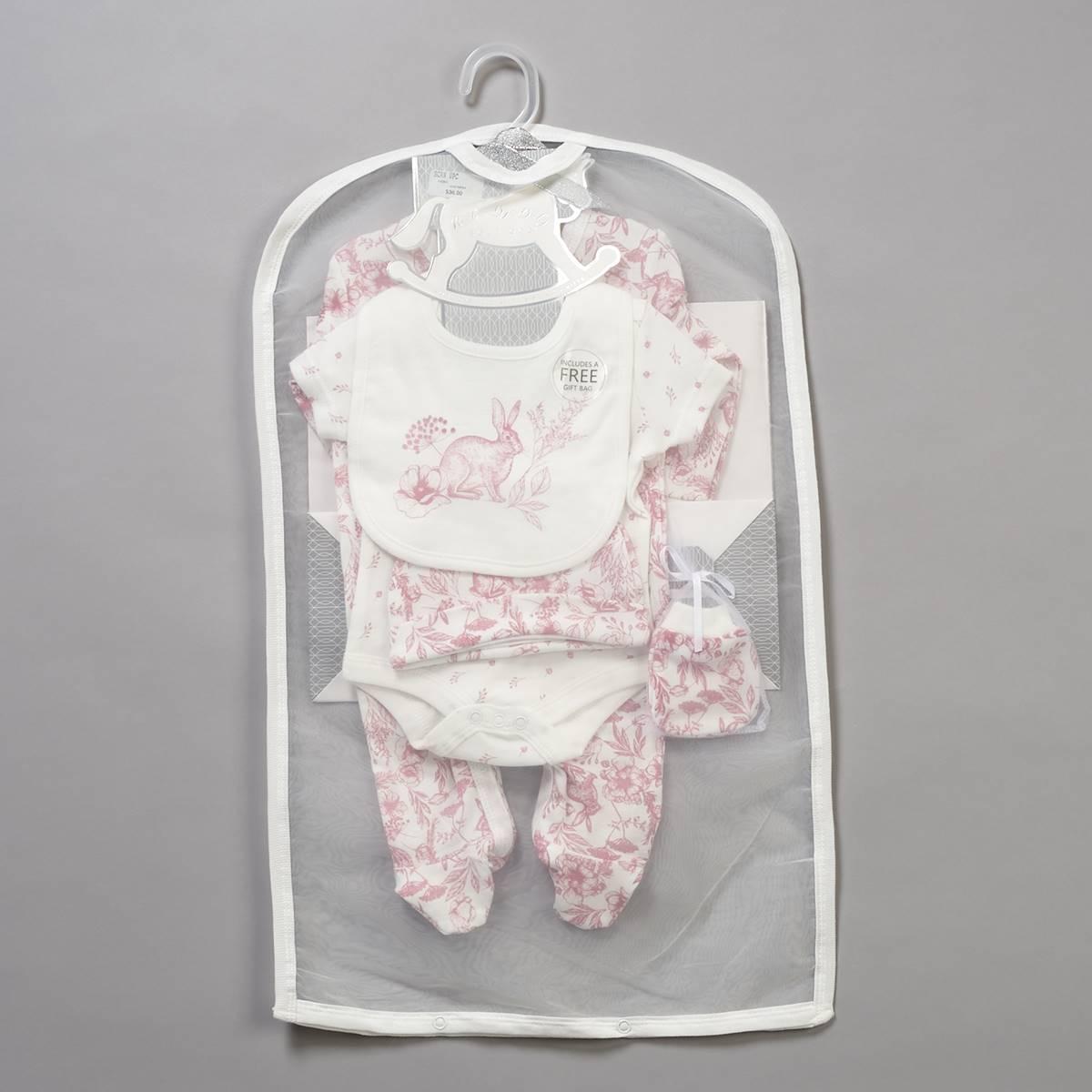 Set Includes: (1) Sleeper, (1) Bodysuit, (1) Bib, (1) Hat, and (1) Pair of Scratch Mittens Sleeper: Pattern: Floral, Bunny Sleeve Length: Long Sleeve Rib-knit trim Full-length snap button closure Built-in footies Bodysuit: Pattern: Floral Sleeve Length: Short Sleeve Rib-knit neckline and hem Overlapped shoulders for easy pull-over Durable snap button bottom Bib: Pattern: Solid Rib-knit trim Embossed bunny and flora graphic Durable snap button closure Hat: Pattern: Floral, Bunny Rolled Hem Scratch Mittens: Pattern: Floral, Bunny Contrasting rib-knit cuffs for a good fit Easy pull-on design Includes a free gift bag.