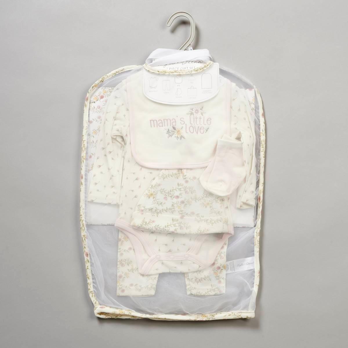 Set Includes: A Bodysuit, Pants, Bib, Hat, Socks, Gift Bag, & Garment Bag Bodysuit: Pattern: Floral Sleeve Length: Long Sleeve Contrasting overlapped shoulders for easy over the head Durable snap button bottom Soft Fabric Pants: Pattern: Floral Covered elastic waist Soft Fabric Bib: Pattern: Solid Square Shaped Contrasting ribbed trim Embroidered "mama's Little Love" text Velcro Closure Soft Fabric Hat: Pattern: Floral Top knot styling Rolled Hem Soft Fabric Socks: Pattern: Color Block Covered elastic cuffs Gripper Bottoms Soft Fabric Ribbed fabric for a comfy fit and stretch Gift Bag: Pattern: Floral Ribbon bow handles Dimensions: 10 1/2"H x 12 1/2"W Garment Bag: Sheer Fabric Floral Trim Snap button bottom Warning: The material used to package this product can constitute a potential safety hazard for children. Properly discard all packaging before giving it to a child.