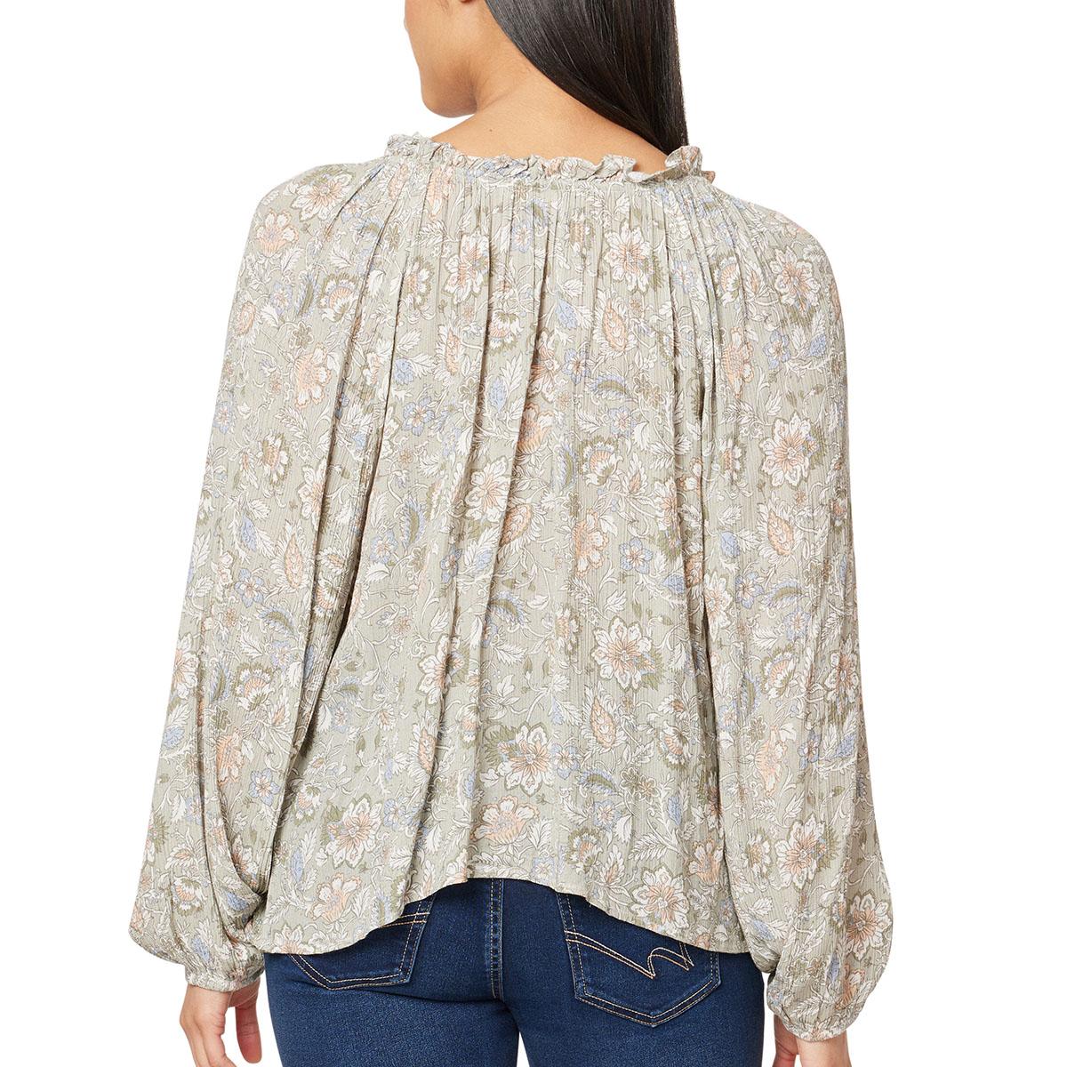 Pattern: Floral Sleeve Length: Long Peasant Sleeve Neck: V-Neck Tassel tie detail on neckline.