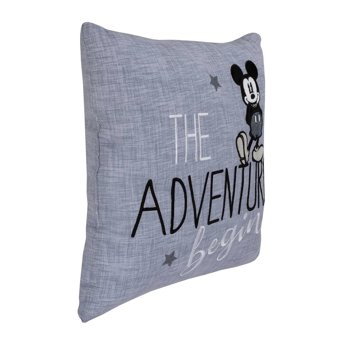 The Adventure Begins with this Disney Call Me Mickey decorative throw pillow! It features a faux chambray look and has an embroidered script reading "The Adventure Begins". The front also features a large Mickey Mouse applique and embroidered stars. A wonderful decorative accent for any nursery or toddler room!.