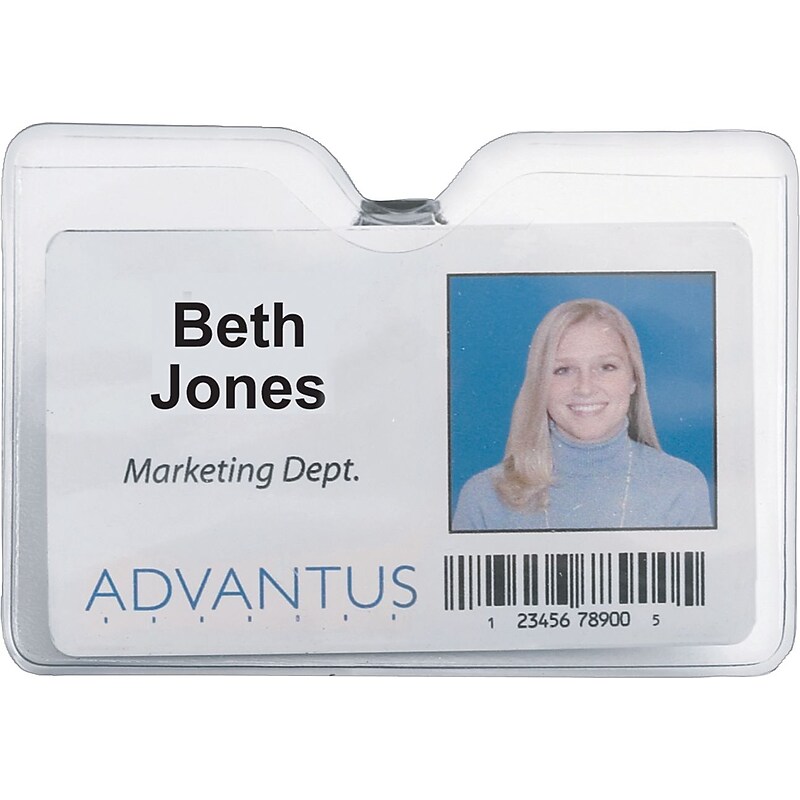 Advantus ID Badge horizontal holder color has insert size. Badge comes with clip that secures your ID card. insert size. For security and ID cards. Made of clear, sturdy vinyl. Horizontal configuration with clip. 50 per pack. Advantus ID Badge horizontal holder with clip is made of sturdy vinyl construction while making it ideal for your ID cards.
