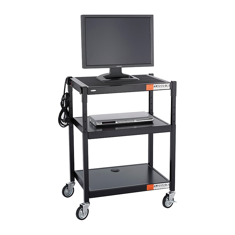 This cart has a flat panel screen that can be easily moved along with your other AV needs.steel. No. of shelves: 3. Dimensions: 36 1/2" to 28 1/2"H x 27 1/4"W x 18 1/4"D. Compatibility: 20" monitor. Shelf type: Flat. Caster/glide/wheel: Four 4" casters (2 locking). No. of electrical outlets: 6. Paint/finish: Powder coat. Height adjustability: 2" increments. Weight capacity: 40 lbs. (shelf). Material thickness: 16 ga (tube), 14 ga (shelf). Includes electrical assembly with surge protector. Ideal for classroom, training center, conference room, media center, library and office. UL approved, GREENGUARD certified. Weight: 56 lbs. Safco Limited Lifetime Warranty. Dimensions: 36 1/2" to 28 1/2"(H) x 27 1/4"(W) x 18 1/4"(D). Contents not included. ⚠ WARNING: This product can expose you to chemicals including Lead, which is known to the State of California to cause cancer or birth defects or other reproductive harm. For more information go to www. P65Warnings. ca. gov/furniture. Safco 8932 Steel Adjustable Height Cart has a flat shelf that is ideal for classroom, training center, conference room, media center, library, and office.