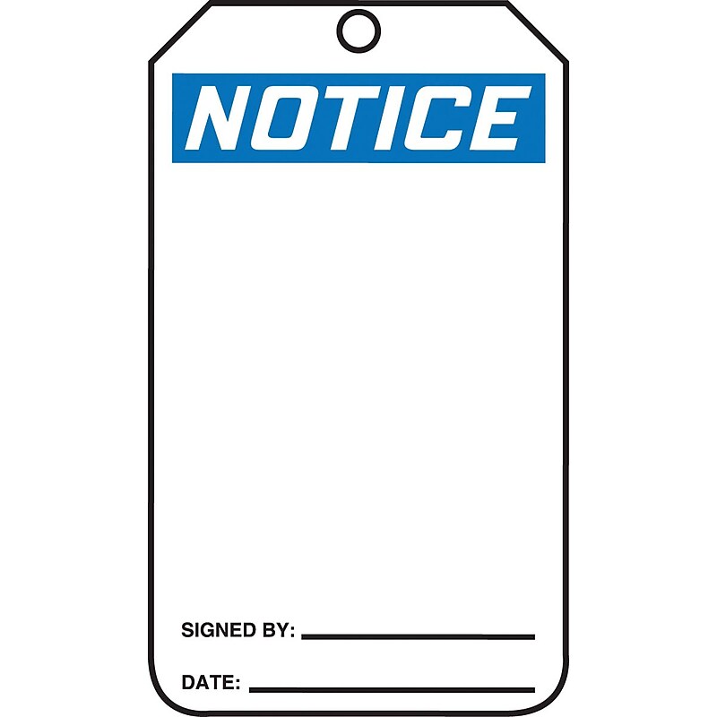 Accuform Signs "Notice" PF-Cardstock safety tag in blackon white is used during maintenance preventing machine operation/power activation. Tag has two blanked line area at bottom that is labeled as signed by and date, sold as 25 per pack. Size: 5 3/4"(L) x 3 1/4"(W). Legend: "Notice". Package: 25/pack. Language: English. Tear-resistant, waterproof matte surface is easy to write on with pen or marker, and will not crack, distort, or shrink. Tags are pulp free - no wood pulp or paper content - unlike regular cardstock. Tags are pliable, yet will not rip or breakdown in moisture. Tags do not tear readily when tugged on. Ideal for indoor use and short term outdoor exposure. The scuff resistant matte surface is easy to write on. Thin and flexible 10-mil poly-based material contains no wood based, paper content. Complies with OSHA 29 CFR 1910. 145 and ANSI Z535 requirements. Warranty: 30 days limited. Safety Tag. NOTICE (Blank). 10-mil PF-Cardstock. Top has 3/8" plain hole. Accuform Signs "Notice" 5 3/4" x 3 1/4" PF-Cardstock safety tag has dia hole of 3/8" for easy installation and with blank front/back provides a way to attach a customized caution to improve safety, sold as 25 per pack.
