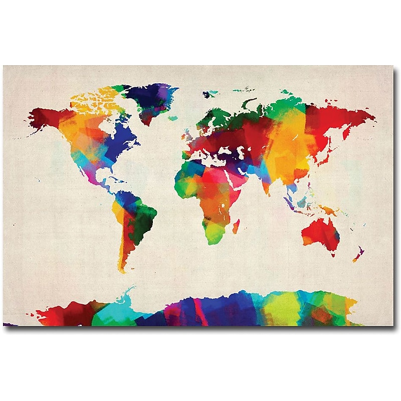 Trademark Global "Sponge Painting World Map" Canvas art by Michael Tompsett is secured by a wooden frame and is wrapped around the sides. Art measuring can be hanged easily and is used in galleries, museums and private collectors. Sponge Painting World Map Canvas Art Type. Michael Tompsett Artist. Rectangle shape. Ready to hang. Giclee (jee-clay) is an advanced printmaking process for creating high quality fine art reproductions. Attainable excellence that Giclee printmaking affords makes the reproduction virtually indistinguishable from the original piece. Wide acceptance of Giclee by galleries, museums and private collectors. Gallery wrap is a method of stretching an Artist's Canvas so that the Canvas wraps around the sides and is secured in a hidden, Wooden frame. Method of stretching and preparing a Canvas allows for a frameless presentation of the finished painting. 30 days warranty. Size: 24". Trademark Global Michael Tompsett "Sponge Painting World Map" Canvas Art is made using Giclee, an advanced print making process that creates high quality fine art reproductions.
