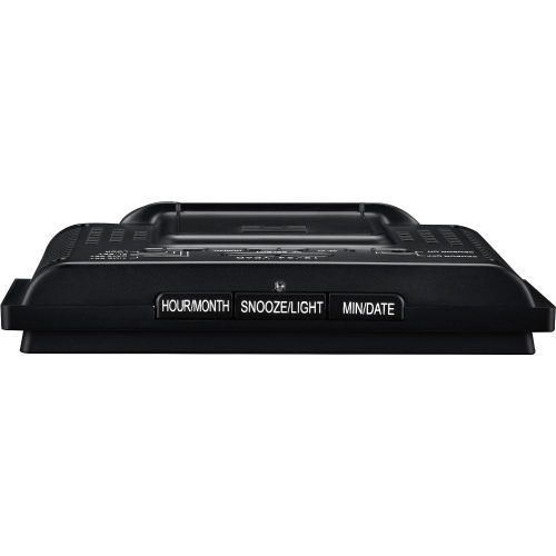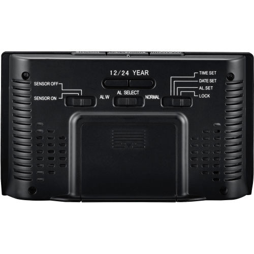 Features: Indoor Temperature and Humidity DisplayDual Alarms for two separate wake timesLarge, easy to read displayChoice of 12 hour or 24 hour timeColored backlight which can automatically turn on when it gets darkMonth and Date displaySnooze Button with 5 minute intervalsRequires 3 AA Batteries (included) Clock Dimensions: 6-1/3" W x 1-3/4" D x 3-1/4" H.