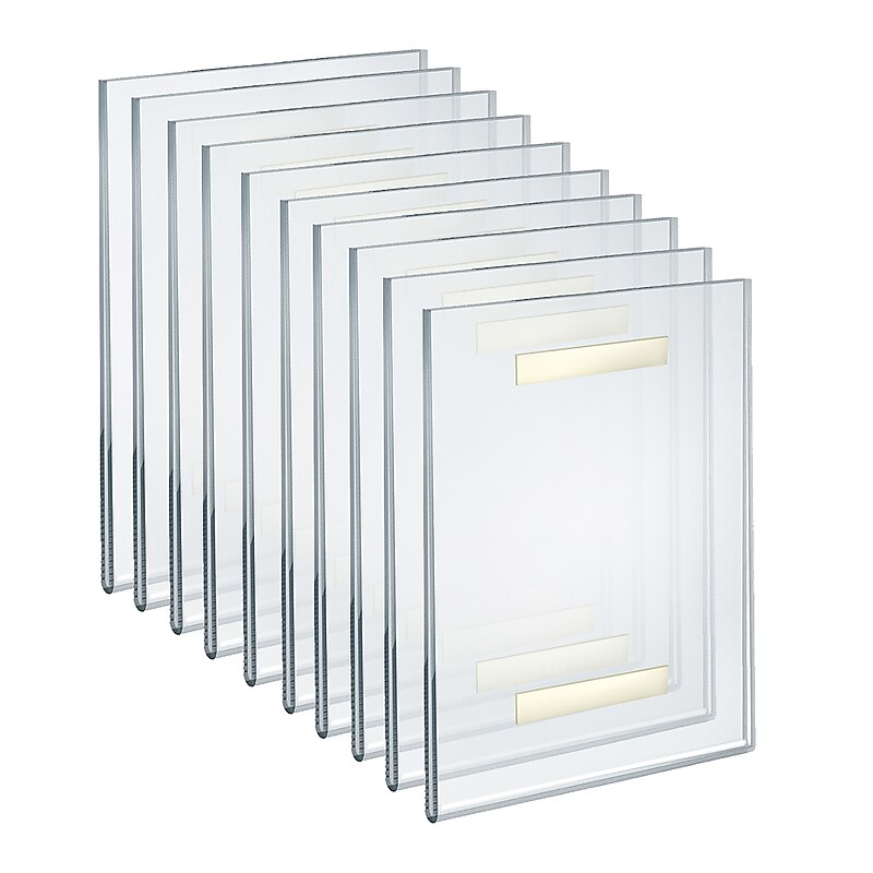 Ensure your messages remain visible throughout your building with these wall signs. The adhesive tape affixes securely to walls and other flat surfaces for a firm hold, and the generous dimensions accommodate letter-size fliers, maps and signs. These Azar wall signs feature sturdy acrylic construction for enduring quality. Signs last longer when they're encased in these handy acrylic vertical wall-mount sign holders. These sign holders protect your signs and ensure they're always visible in needed areas, and they come with adhesive strips on the back that allow you to quickly affix them to a variety of surfaces. Wall sign holder lets you conveniently display signage to ensure maximum visibility.acrylic offers durability and better visibility. Top/side loading design with portrait orientation. Dimensions: 11"H 8. 5"W. Designed to hold display literature that measures 8. 5"W 11"H. 10 per pack. Can be mounted on a wall for easy viewing. Double-sided adhesive tape on the back for hanging on most surfaces. Post promotional, informational or directional signage with these Azar 8. 5 11-inch adhesive tape wall signs.