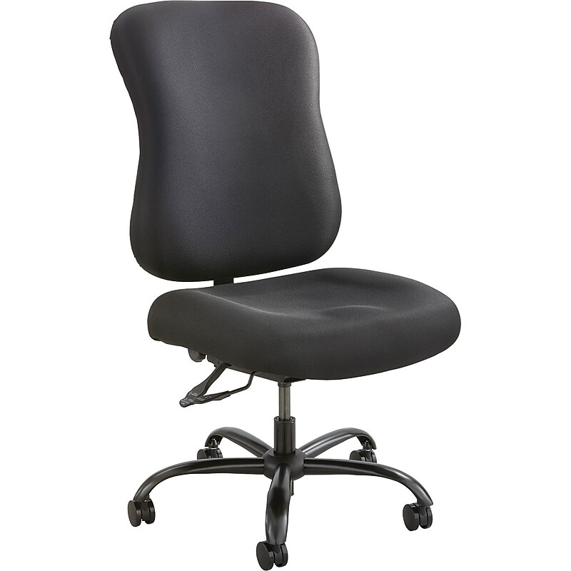 Safco Optimus Big & Tall Chair, Fabric, Seat: 23"W X 22"D, Back: 22"W X 25"H. Fabric material. Black seat/back. Overall dimensions: 42 1/2"- 45 1/2"H x 25"W x 25"D. Partial assembly required. 400 lb. , weight capacity. Reinforced mechanism to ensure you get the proper support. Back height adjustment. Back tilt, tilt lock, tilt tension. Optional height and width adjustable t-pad arms. Five-star base is oversized for stability and equipped with 2-1/2" diameter, dual-wheel carpet casters that roll easily from workstation to workstation. Steel frame. Designed with every shape and size in mind. Pneumatic seat-height adjustment. Mfg. Limited Lifetime Warranty. ⚠ WARNING: This product can expose you to chemicals including Acetaldehyde and Ethylene Glycol, which are known to the State of California to cause cancer or birth defects or other reproductive harm. For more information go to www. P65Warnings. ca. gov/furniture.
