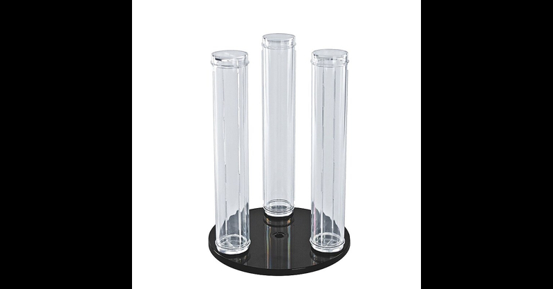 Wrist watch or bracelet vertical counter display revolves on a diameter base which is black in color. Counter display consists of three 12"eight and 2" diameter poles which are made long lasting. Bracelet poles that revolve on a diameter black base. 12"(H) x 2"(Dia). Used to display wrist watch/bracelet. Acrylic. Azar Wrist watch or bracelet vertical counter display has three poles of 12"and 2" diameter.