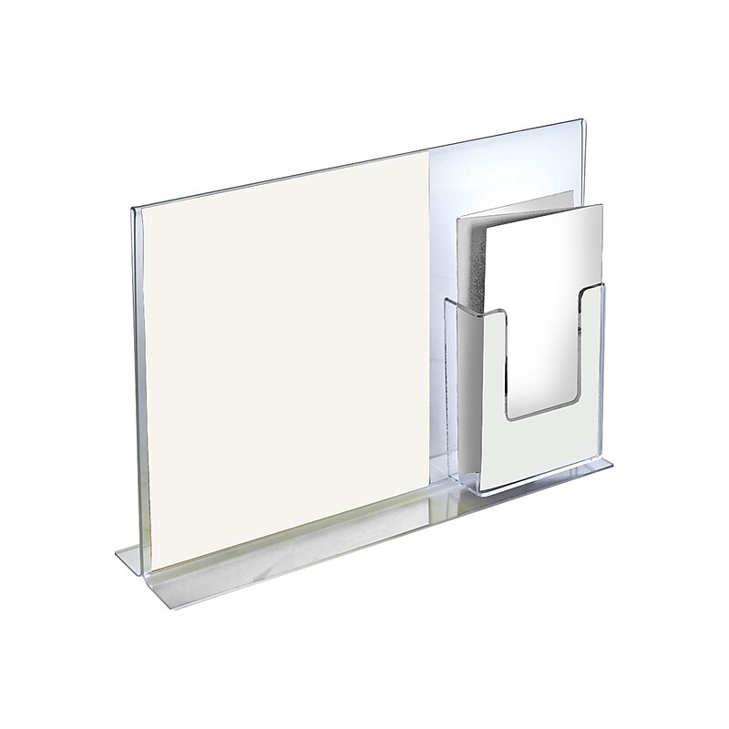 Make vertical signs readable from multiple angles with these Azar acrylic sign holders. They areso signs can be read from multiple angles, while acrylic construction provides durability. Place brochures in the attached brochure holder, and insert two printed advertisements through the bottom of these Azar acrylic sign holders for easy double-viewing. Desktop sign holder features attached brochure pocket and lets you conveniently display signage to ensure maximum visibility. Clear acrylic construction for durability and better visibility. Holds bottom-loaded literature with landscape orientation, while attached brochure pocket provides convenient top loading of materials with portrait orientation. Overall dimensions: 11"H 14"W. Designed to display literature that measures 8. 5"W 11"H and hold tri-fold brochures in attached pocket. Comes with attached brochure holder measuring 6"H 4. 13"W 1. 25"D. Two sign holders per pack. Double-sided design lets you display and highlight information on both sides. Can be placed on desktops for easy viewing. Display two signs simultaneously with this two-pack of Azar acrylic 11 14-inch double-foot vertical double-sided sign holders with attached brochure holder.